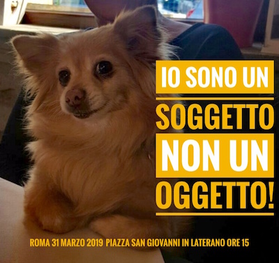 Il Comitato Tutela Diritti Animali organizzerà il 31 marzo a Roma, in Piazza San Giovanni in Laterano alle ore 15.00, la Manifestazione Nazionale “SOGGETTInonOGGETTI” per chiedere che il Codice Civile riconosca finalmente tutti gli animali come esseri senzienti