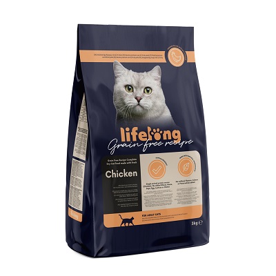 Lifelong Grain free Recipe Alimento secco per gatti adulti con pollo fresco, 3kg. Alimento ipoallergenico completo per animali domestici prodotto con una ricetta premium con ingredienti naturali e il 62% di pollo come singola fonte di proteine animali. Senza grano, mais, soia, uova, lattosio o glutine aggiunti.