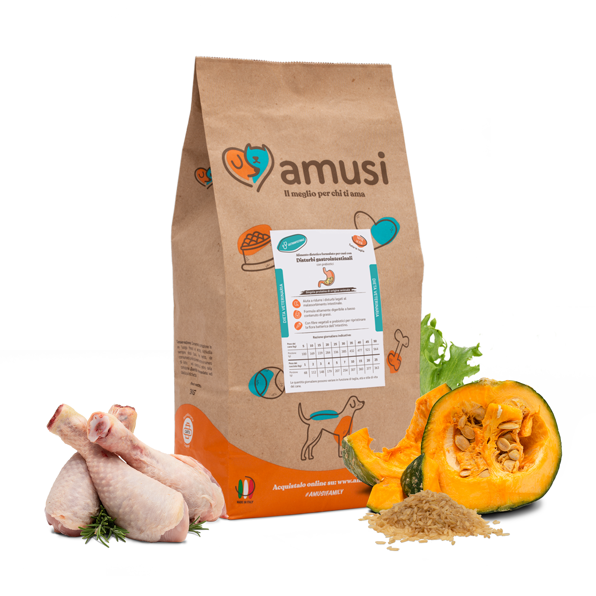 Le crocchette per cani con disturbi intestinali amusi sono un alimento altamente digeribile formulato appositamente per cani sensibili. La loro formula è a basso contenuto di grassi per renderle estremamente leggere, arricchita con sodio e potassio per compensare le perdite di sali minerali dovute ai sintomi della cattiva digestione, e infine contiene fibre solubili e prebiotici per garantire il ripristino della flora batterica intestinale.