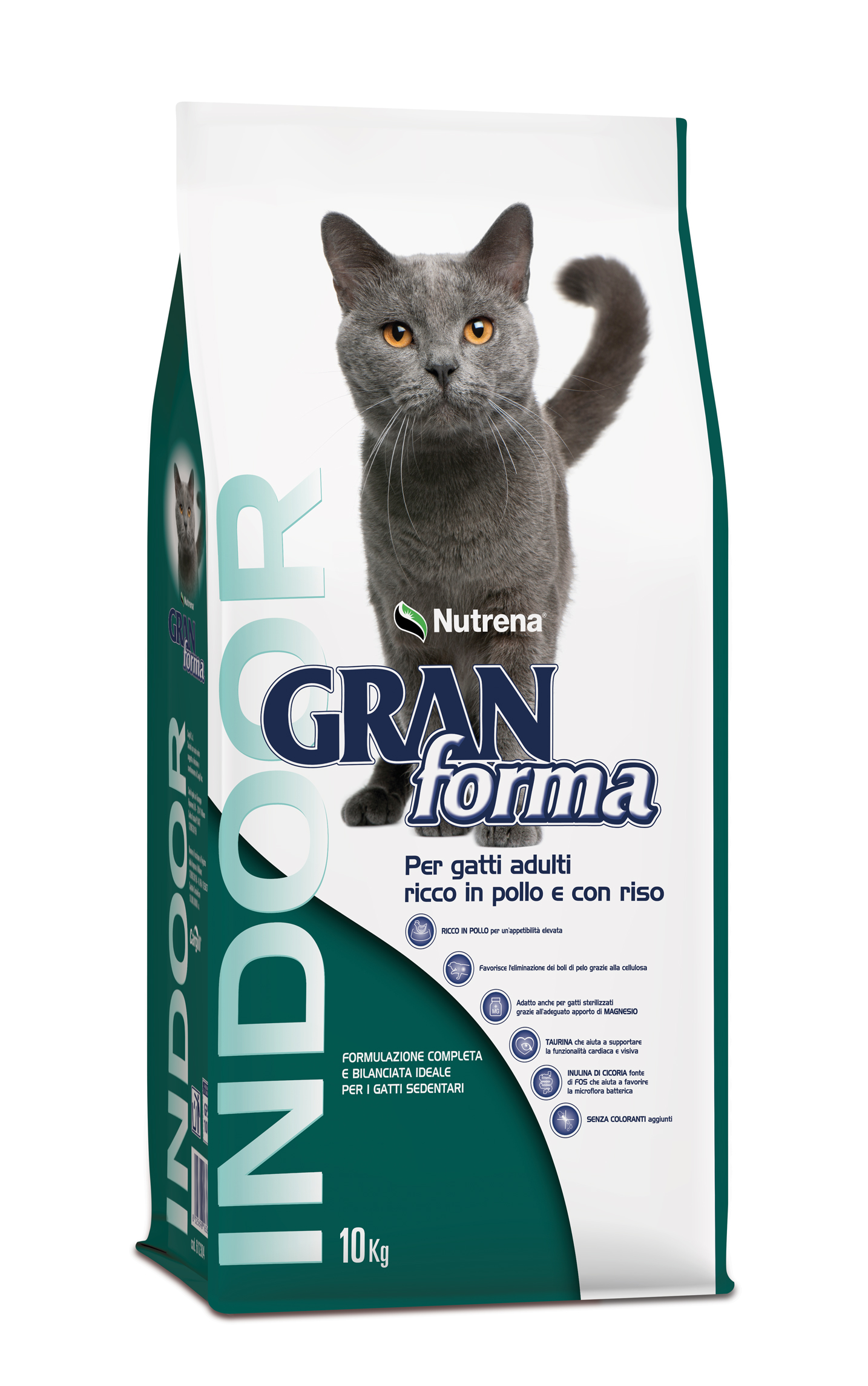 GRANforma Indoor è l’alimento secco completo studiato specificatamente per rispondere alle esigenze quotidiane dei gatti adulti che vivono prevalentemente in casa, ma, grazie al corretto apporto di magnesio e fosforo per il benessere ed il buon funzionamento del sistema urinario, risulta ideale anche per gatti sterilizzati che tendono ad essere più predisposti all’insorgenza di problemi urinari. Estremamente digeribile ed appetibile, GRANforma Indoor è arricchito con cellulosa e fibre vegetali, che favoriscono la naturale eliminazione dei boli di pelo, la presenza di inulina di cicoria favorisce invece il benessere intestinale e l’equilibrio della microflora batterica. Infine, la presenza di Omega 3 e 6 favorisce salute e bellezza di pelle e pelo.