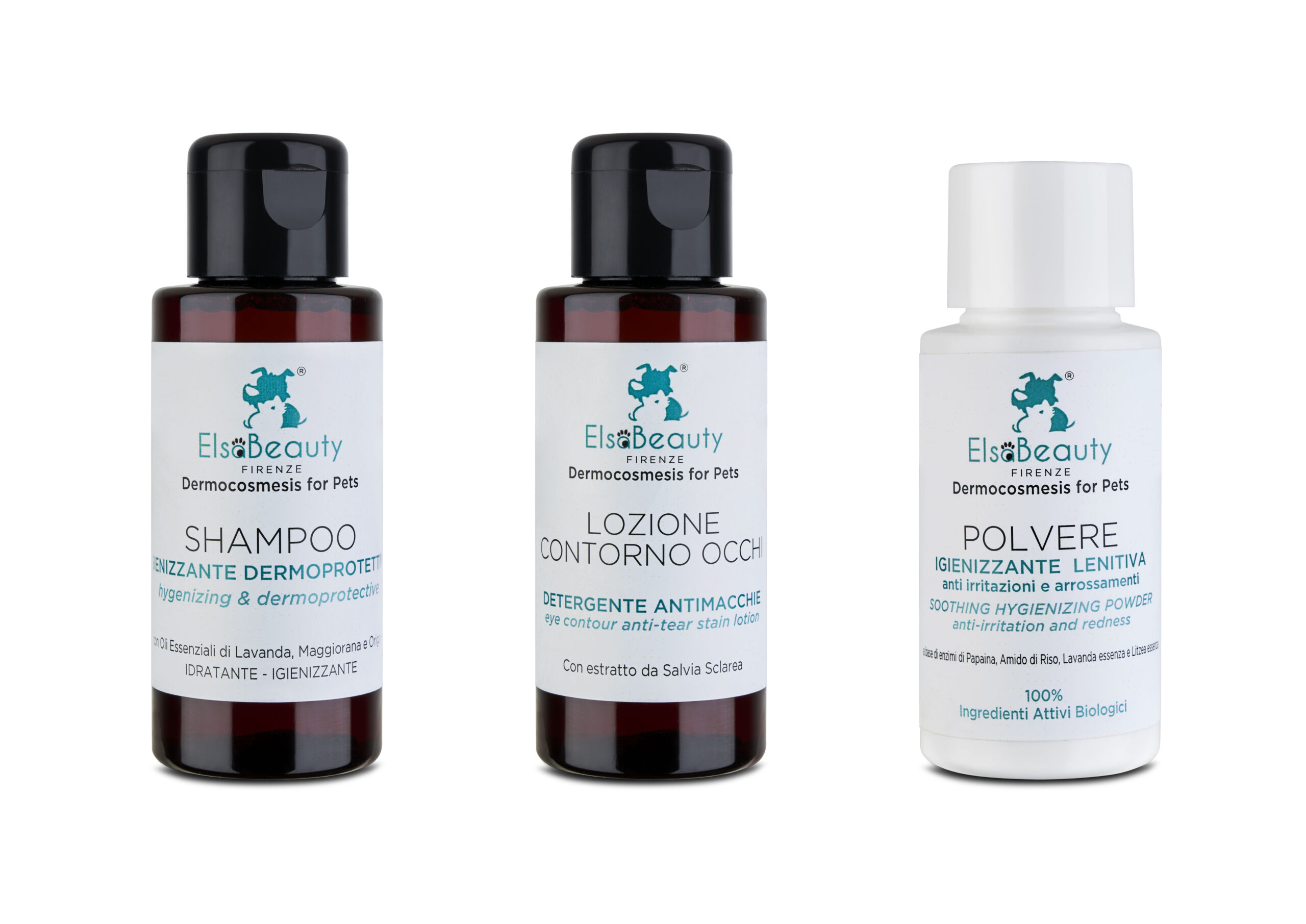 Tre nuovi formati, quattro speciali combinazioni, degli esclusivi prodotti ElsaBeauty Dermocosmesis for Pets per averli sempre con voi e soddisfare le esigenze dei coinquilini a quattro zampe: Shampoo Dermoprotettivo e Lozione Occhi Detergente nel nuovo formato da 50 ml e Polvere Lenitiva nel formato da 20 ml in un’offerta speciale.