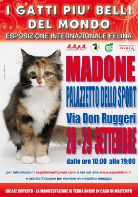 A Madone (Bergamo) un grande evento alla sua seconda edizione: I GATTI PIU’ BELLI DEL MONDO con la partecipazione di centinaia di gatti presso il Palazzetto dello Sport di Via Don Giovanni Ruggeri nei giorni di sabato 28 e domenica 29 settembre, orario dalle ore 10 alle ore 19, si svolgerà l’Esposizione Internazionale Felina” con la partecipazione di tanti gatti di razza che, sotto l’egida della Federazione Italiana Associazioni Feline, verranno giudicati da Giudici Internazionali WCF nel Best in Show in programma al pomeriggio di entrambe le giornate.