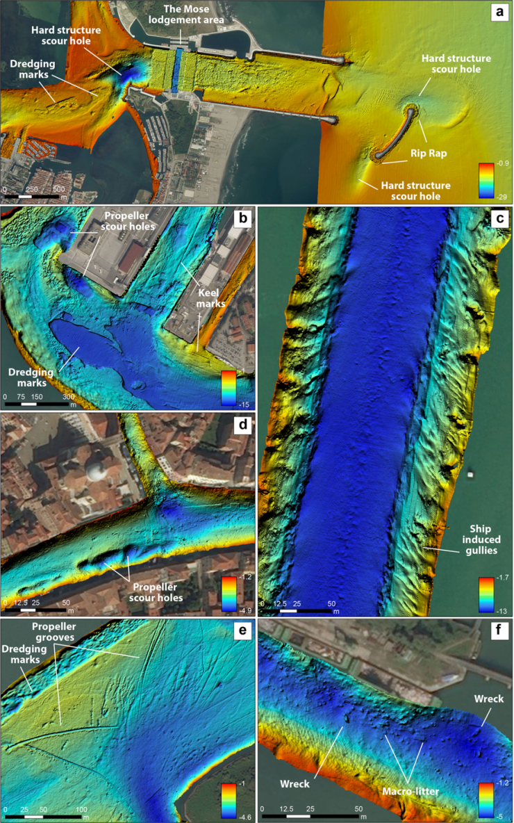 “Grazie a una sorta di ecografia del fondale, ottenuta grazie ad uno strumento che ‘vede’ con risoluzione centimetrica su una fascia larga alcune decine di metri ai lati dell’imbarcazione, che si muove su rotte successive tra loro parallele, sono stati per la prima volta documentate tracce di dragaggi, solchi incisi dalle chiglie di navi fuori rotta su bassi fondali o dai motori delle barche e dalle eliche dei vaporetti alle fermate, che in condizioni di bassa marea ‘arano’ il fondale”, spiega Fantina Madricardo, prima firmataria di questo articolo scientifico. “Di grande rilevanza sono le strutture erosive operate dalle correnti di marea attorno alla maggior parte delle infrastrutture costiere realizzate su base subacquea, come i moli detti ‘lunate’ che proteggono le bocche di porto dalle onde marine, dove si sono formate depressioni di alcuni metri nel giro di pochissimi anni successivi alla loro costruzione. Effettuare rilievi ripetuti nei prossimi anni con gli stessi strumenti utilizzati in questo studio permetterà di individuare precocemente e, sperabilmente, prevenire eventuali crolli delle dighe stesse”.