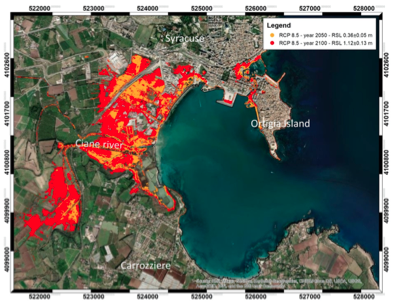 Le coste della Sicilia sud-orientale potrebbero subire una progressiva sommersione, con una perdita presunta di circa 10 kmq di superficie nel 2100, a causa dei cambiamenti climatici del pianeta.