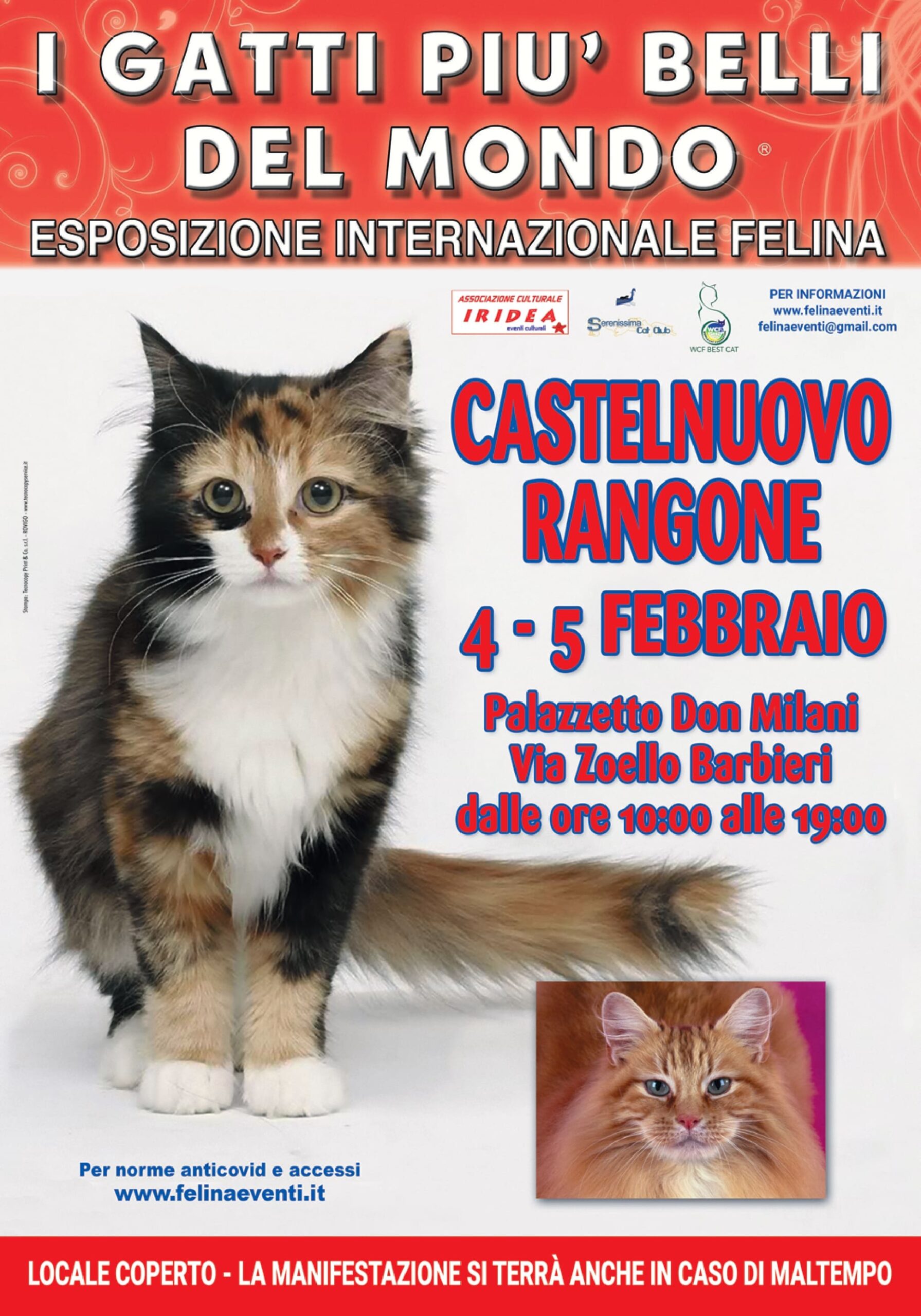 Al Palazzetto dello Sport Don Milani di CASTELNUOVO RANGONE nelle giornate di sabato 4 e domenica 5 febbraio, con orario dalle ore 10 alle ore 19, si svolgerà l’Esposizione Internazionale Felina “I GATTI PIU’ BELLI DEL MONDO” con la partecipazione di tanti gatti di razza che, sotto l’egida dell’Associazione Serenissima Cat Club verranno giudicati da Giudici Internazionali WCF nel Best in Show in programma al pomeriggio di entrambe le giornate.