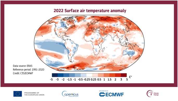 I nuovi dati del Servizio per il Cambiamento Climatico di Copernicus dell’Unione Europea rivelano un altro anno caratterizzato da eventi climatici estremi, con un elevato numero di temperature record e un aumento persistente delle concentrazioni di gas serra nell’atmosfera. L’estate 2022 è stata la più calda mai registrata in Europa e ogni mese estivo boreale è stato almeno il terzo più caldo a livello globale. Complessivamente, il 2022 è stato il secondo anno più caldo mai registrato in Europa, mentre a livello globale è stato il quinto anno più caldo secondo il set di dati ERA5.