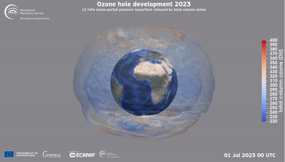 Il buco dell’ozono antartico è un fenomeno atmosferico che si verifica ogni anno in primavera. In condizioni normali nella stratosfera dell’emisfero meridionale, il buco inizia a formarsi a metà/fine agosto, quando il Sole sorge sopra il Polo Sud, e si chiude verso la fine del mese di novembre. La combinazione delle rianalisi ERA-5 e CAMS fornisce un set di dati di 43 anni sull’ozono totale della colonna, fornendo un contesto dello sviluppo di ogni anno. Nel 2023 lo sviluppo è iniziato insolitamente presto, dopo che per tutto il mese di luglio si sono registrati alcuni dei valori minimi di ozono totale della colonna nell’emisfero meridionale negli ultimi quattro decenni. Per questo motivo, la sua area totale è attualmente relativamente alta, anche se la sua progressione ha seguito un modello di crescita abbastanza tipico.