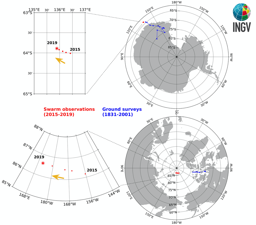 “I risultati”, aggiunge Mauro Regi, ricercatore dell’INGV e primo autore dello studio, “in accordo con l’attuale 13esima generazione del modello internazionale di riferimento del campo geomagnetico (IGRF), hanno la prerogativa di restituire un’informazione immediata e diretta da osservazioni sperimentali. Entrambi i poli magnetici si muovono in direzione nord-ovest ma mentre il polo nord si muove alla velocità di circa 37-72 km all’anno, la velocità del polo sud è di circa 5-9 km all’anno. Dalle nostre analisi, quindi, il polo nord magnetico ha abbandonato i territori settentrionali del Canada e si dirige verso la Siberia, mentre il polo sud magnetico si muove più lentamente verso l’oceano aperto, dal settore antartico che ospita la stazione francese Dumont D’Urville”.