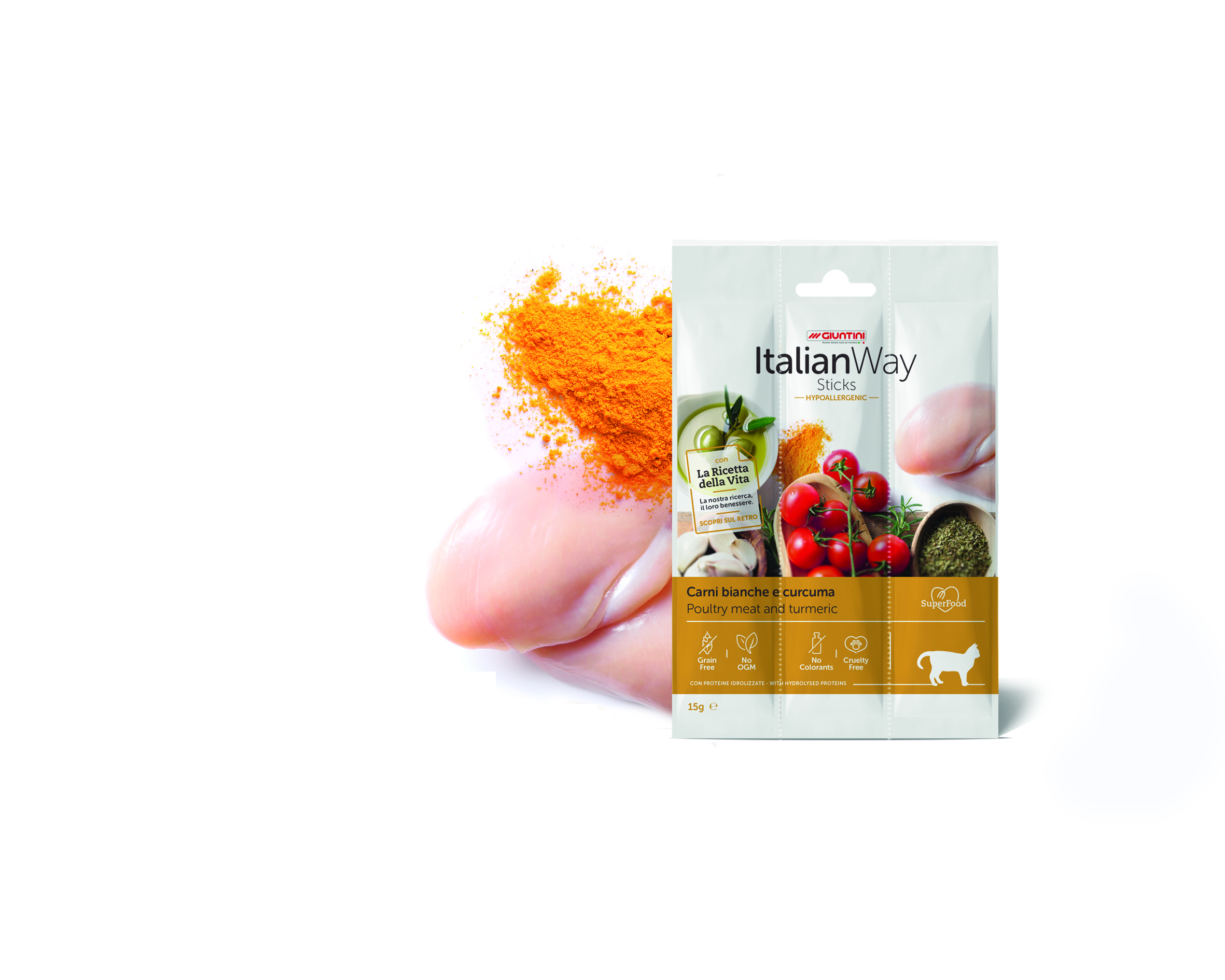 Lo stick per gatti Italian Way con carni bianche & curcuma, contiene un’alta percentuale di carne fresca di pollo e tacchino, è privo di cereali, è ipoallergenico e senza coloranti. Per preservare al meglio il gusto naturale è cotto lentamente in forno.