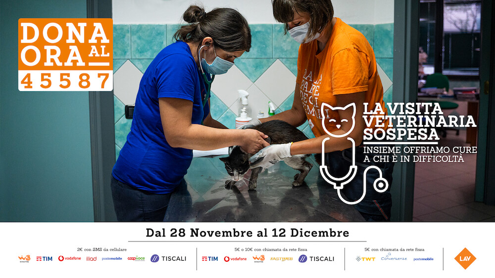 Il Progetto “La visita veterinaria sospesa” ha l’obiettivo di prestare assistenza veterinaria a cani e gatti bisognosi di cure urgenti: con un SMS o una chiamata da rete fissa al numero 45587 sarà possibile donare 2, 5 o 10 euro.
