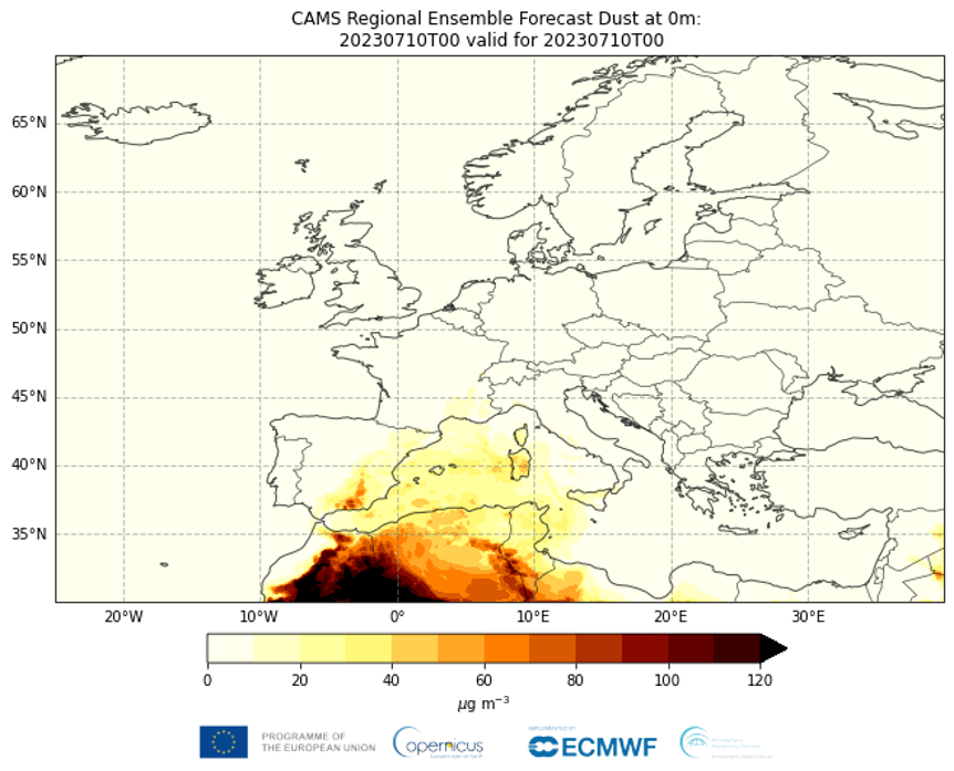 Le previsioni sul particolato del Servizio di monitoraggio dell’Atmosfera di Copernicus mostrano un trasporto di polvere sahariana su larga scala attraverso il Mediterraneo. Le polveri avranno un impatto sulla qualità dell’aria nella maggior parte del Mediterraneo occidentale, in particolare in Spagna, dove si prevede che un elevato livello di PM10 in superficie coprirà gran parte del Paese, con un picco nella zona dell’11 luglio.