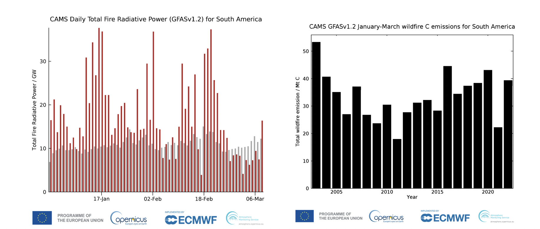 L’analisi di CAMS Global Fire Assimilation System indica che l’attività degli incendi in Paraguay e Argentina tra il 1° gennaio e il 28 febbraio ha raggiunto valori da record in termini di emissioni stimate di carbonio dall’inizio del 2003, anno in cui è stato avviato il dataset. Nell’Argentina settentrionale gli incendi hanno continuato a divampare in tutta la provincia di Corrientes e nelle zone umide dell’Ibera e, sebbene il totale giornaliero delle emissioni stimate sia stato inferiore nella prima settimana di marzo rispetto a gennaio e febbraio, esse rimangono comunque superiori alla media 2003-2021. I dati GFAS tra il 1° gennaio e il 28 febbraio evidenziano emissioni totali di carbonio stimate per gli incendi in Paraguay di circa 5 megatonnellate, mentre le emissioni totali di carbonio stimate per l’Argentina nello stesso periodo raggiungono quasi le 12 megatonnellate, con oltre 8,5 megatonnellate derivanti dagli incendi nel nord del paese e 5,5 di queste provenienti dalla sola provincia di Corrientes.