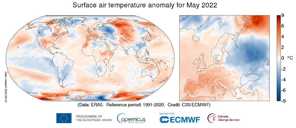 Maggio 2022 è stato, globalmente, il quinto più caldo mai registrato, insieme a maggio 2018 e 2021.