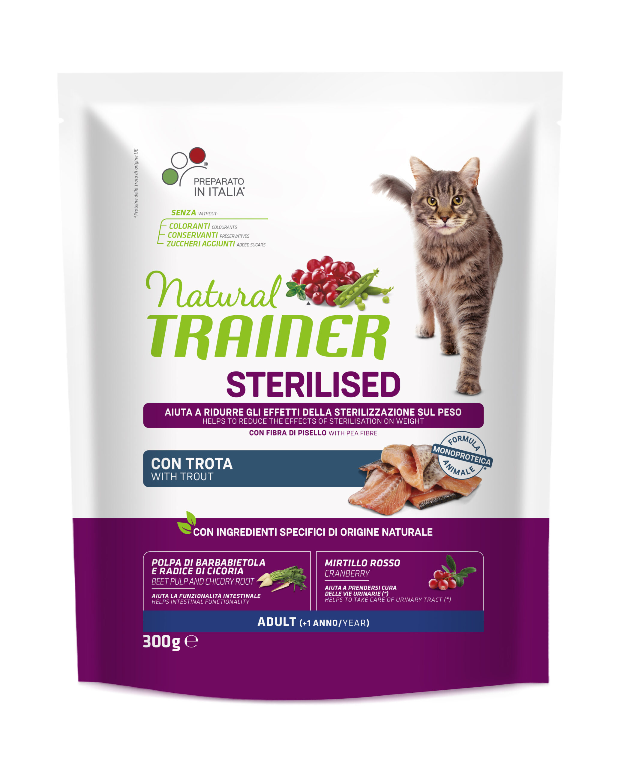 Natural Trainer integra la gamma pensata appositamente per l’alimentazione dei gatti sterilizzati con l’introduzione sul mercato di due nuove referenze monoproteiche. La linea top selling Natural Trainer Sterilised si arricchisce, con l’obiettivo di rispondere a nuovi bisogni e nuove preferenze con le due varianti di cibo secco ai gusti trota e anatra.