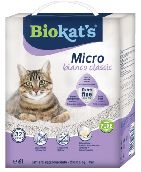 La linea di lettiere Biokat’s Micro bianco si compone di 3 diverse referenze: Biokat’s Micro bianco classic, senza profumo; Biokat’s Micro bianco fresh, con profumo di primavera; Biokat’s Micro bianco extra, arricchita con carbone attivo.