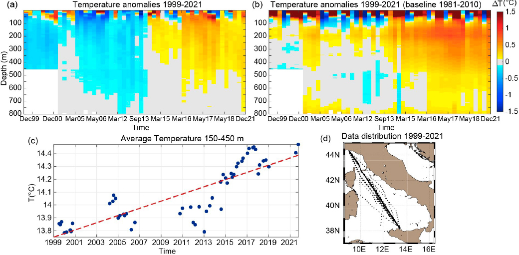 “Dalla primavera 2013, constatiamo un riscaldamento progressivo nello strato tra 150 e 450 m di profondità, con una crescita ancora più evidente tra il 2014 e il 2017, seguita da un leggero calo nel 2018-2019 e una risalita ulteriore nel 2021” sottolinea Simona Simoncelli. “Per i mari Tirreno e Ligure, nel periodo 1999-2021 la variazione di temperatura è stata pari a 0.028°C/anno, coerente con quanto registrato nel Canale di Sicilia dalla strumentazione CNR che acquisisce valori dal 1993. Nei loro dati l’aumento della temperatura è stimato in 0.026°C/anno su tutto il periodo, ma con una crescita di 0.034°C/anno dopo il 2011. Nei nostri dati complessivamente la variazione media della temperatura nello strato 150-450 m è di circa 0.6°C”.