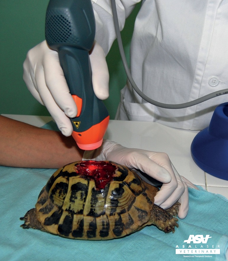 “Appena arrivata – racconta Giordano Nardini, Dip. ECZM, European Specialist in Zoological Medicine della Clinica Veterinaria Modena Sud – Marta presentava una ferita lacera del carapace con perdita di tessuto osseo nella regione del ponte ed esposizione della membrana celomatica. Abbiamo proceduto ad un intervento di osteosintesi per stabilizzare il carapace mediante infissione di un chiodo di Kirschner e, a seguire, abbiamo impostato diverse terapie: antibiotica, antinfiammatoria, reidratazione, bendaggi umidi asciutti e Laserterapia MLS una volta al giorno per 10 giorni. Dopo questa prima sessione, apparendo la lesione non più a rischio infezione, si è proseguito con la Laserterapia a giorni alterni sino a raggiungere la piena cicatrizzazione con tessuto connettivo maturo di consistenza dura ai margini”.