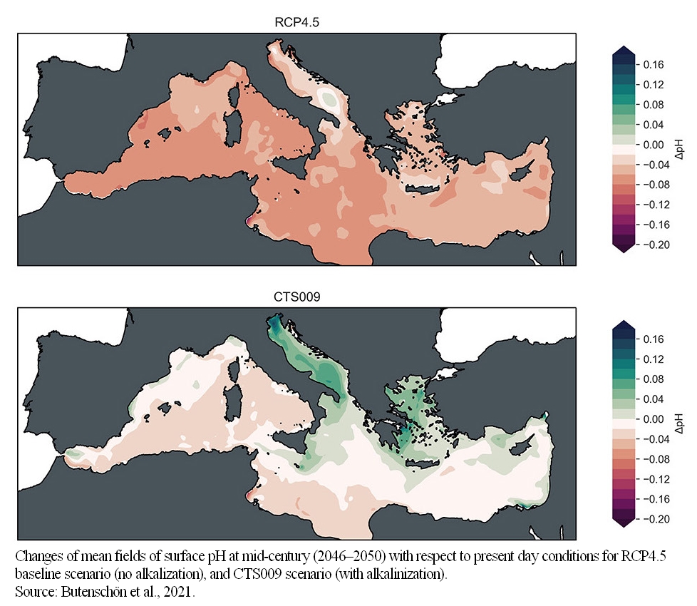 Le simulazioni modellistiche dello studio suggeriscono la potenzialità di raggiungere un tasso di assorbimento di anidride carbonica del Mar Mediterraneo quasi raddoppiato dopo 30 anni di alcalinizzazione, e di neutralizzare la tendenza media all’acidificazione superficiale che ci sarebbe nello scenario di riferimento, senza alcalinizzazione, durante lo stesso arco di tempo.