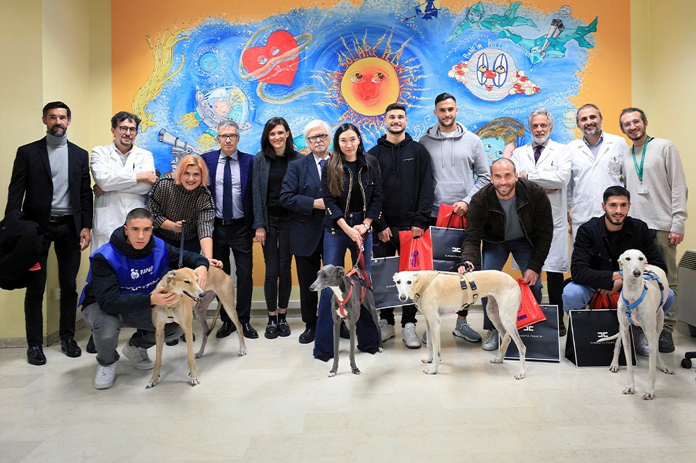 Dalle corse del Regno Unito e dell’Irlanda alle corsie dei reparti pediatrici, dalle battute di caccia in Spagna alle stanze dei piccoli pazienti. Il progetto “Pet Co-therapy” porta i levrieri salvati dai maltrattamenti all’interno dell’IRCCS Policlinico di Sant’Orsola di Bologna con l’obiettivo di sostenere, attraverso i cosiddetti “interventi assistiti con animali”, il benessere di tutti i bambini e degli stessi cani. La nuova iniziativa, nata grazie alla collaborazione tra IRCCS e l’associazione FANEP e al fondamentale sostegno della Fondazione Elisabetta Franchi Onlus e Bologna FC 1909, è stata inaugurata ufficialmente con una visita all’IRCCS della stilista e imprenditrice e una delegazione del Club rossoblù composta dall’Amministratore Delegato Claudio Fenucci accompagnato dai calciatori Lorenzo De Silvestri, Charalampos Lykogiannis, Federico Ravaglia e Riccardo Orsolini.