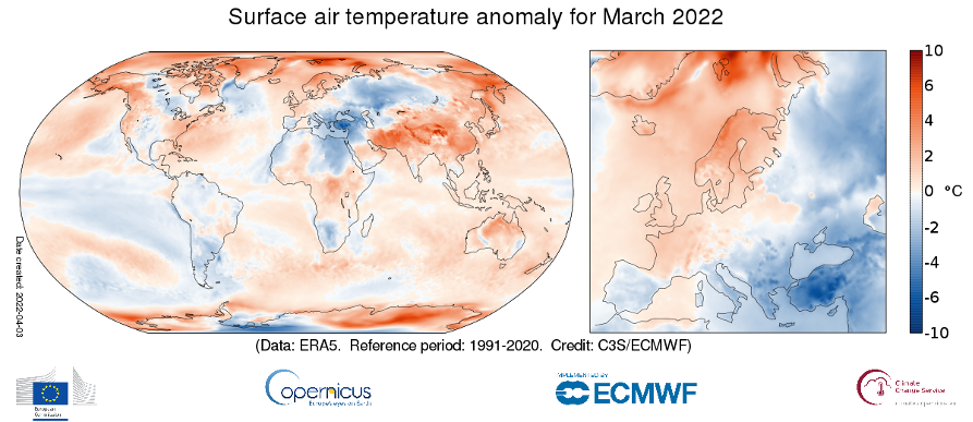 La temperatura media globale per marzo 2022 è stata di circa 0.4ºC superiore alla media 1991-2020, rendendolo il quinto marzo più caldo mai registrato. Nel complesso, l’Europa, è stata circa 0.4ºC più fredda della media in marzo 2022, il terzo più freddo negli ultimi 10 anni. Vi è stato poi un contrasto nelle anomalie di temperatura in Europa, con condizioni più calde della media a nord e più fredde della media a sud. Le condizioni di freddo si sono estese poi all’Africa settentrionale e in Russia. Non solo Sono state registrate condizioni di caldo anomalo anche in gran parte dell’Artico e dell’Antartico. L’Artico ha vissuto il quarto marzo più caldo mai registrato. In Antartide sono stati infine battuti i record giornalieri di temperatura massima.