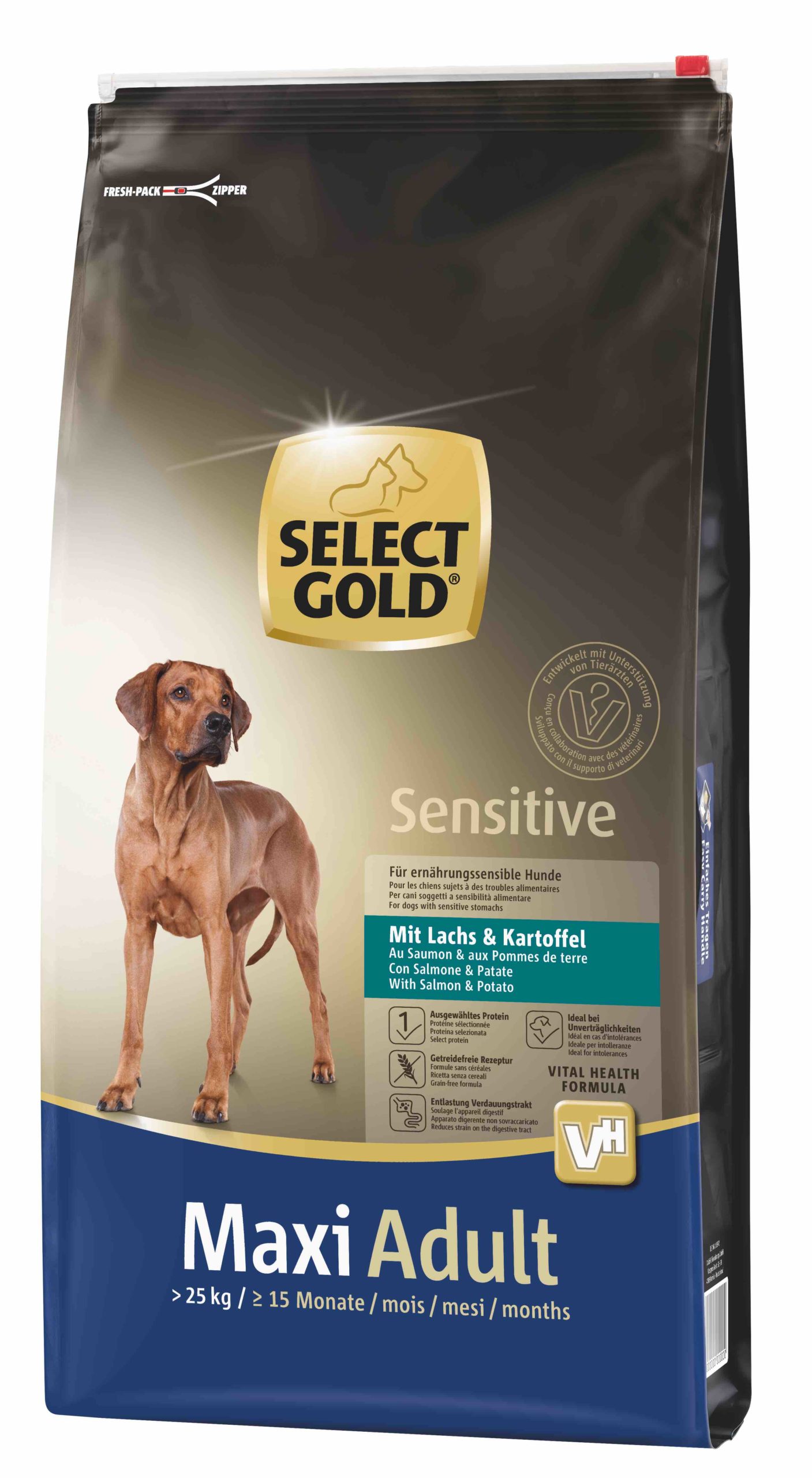 Grazie alla formula Vital Health, studiata e realizzata in collaborazione con veterinari ed esperti di nutrizione, gli alimenti della gamma SELECT GOLD contengono tutte le sostanze nutritive necessarie a garantire salute e benessere agli amici a quattro zampe. Caratteristiche principali dei prodotti sono: ingredienti prebiotici, per una flora intestinale stabile; nessuna aggiunta di zuccheri o soia; senza conservanti, coloranti e aromi artificiali.