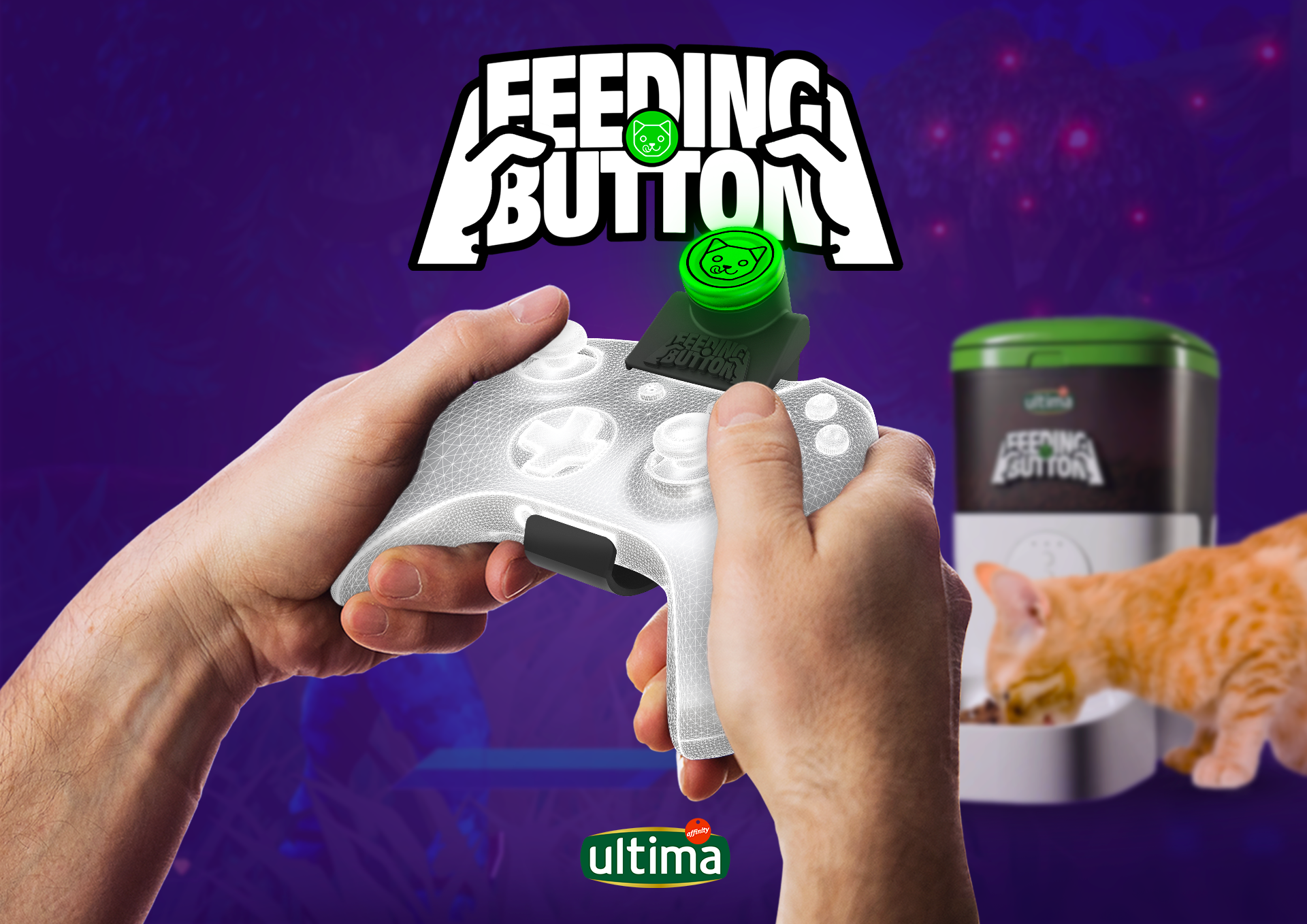 Ma l’ironica soluzione di Ultima Petfood è appunto “Feeding Button”, uno speciale bottone aggiuntivo, dal design pensato per integrarsi sia ai joypad delle più celebri console che alle tastiere dei PC. Un tasto nuovo e potentissimo, che permette di somministrare in remoto e senza togliere le mani dai controlli di gioco una razione predefinita di crocchette, da un dispenser associato al dispositivo. Per placare con un solo tocco e a distanza l’appetito del proprio felino senza dover mollare la partita sul più bello.