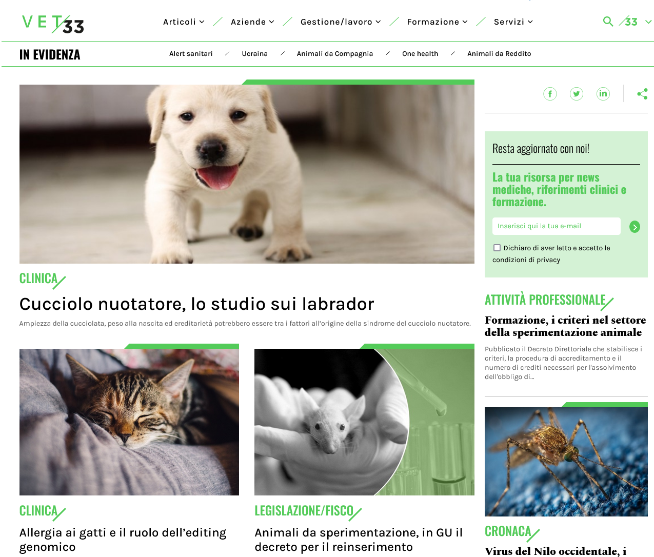 La struttura lineare di Vet33 – caratterizzata da un’interfaccia di navigazione semplice e intuitiva – propone un’offerta contenutistica declinata per macrosettori, e consente una navigazione agile tra le varie sezioni con l’ausilio di un menù di tag contenutistici, che permettono di affinare, fin nei dettagli, la ricerca.